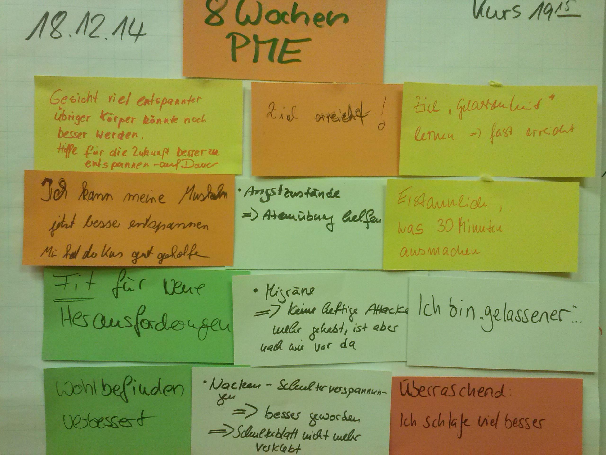 die acht Stunden über acht Wochen „Progressive Muskelentspannung“ waren sehr gut aufbereitet. Jedes Mal kam etwas Neues/Anderes als Übung hinzu, sodass ich viele verschiedene Möglichkeiten lernen konnte, die PME in meinem Alltag zu integrieren, sei es morgens vor dem Aufstehen, in der Sauna im Sitzen oder zum Einschlafen in der Nacht. Annette Friedrich ist eine sehr sympathische Lehrerin. Sie hat in den einzelnen Übungsstunden eine schöne Atmosphäre im Raum bereitet und uns in einer kleinen Gruppe durch die Übungen begleitet. Vielen Dank, Annette, ich habe sehr viel mitgenommen und denke bei jeder Übung an unsere Zeit!