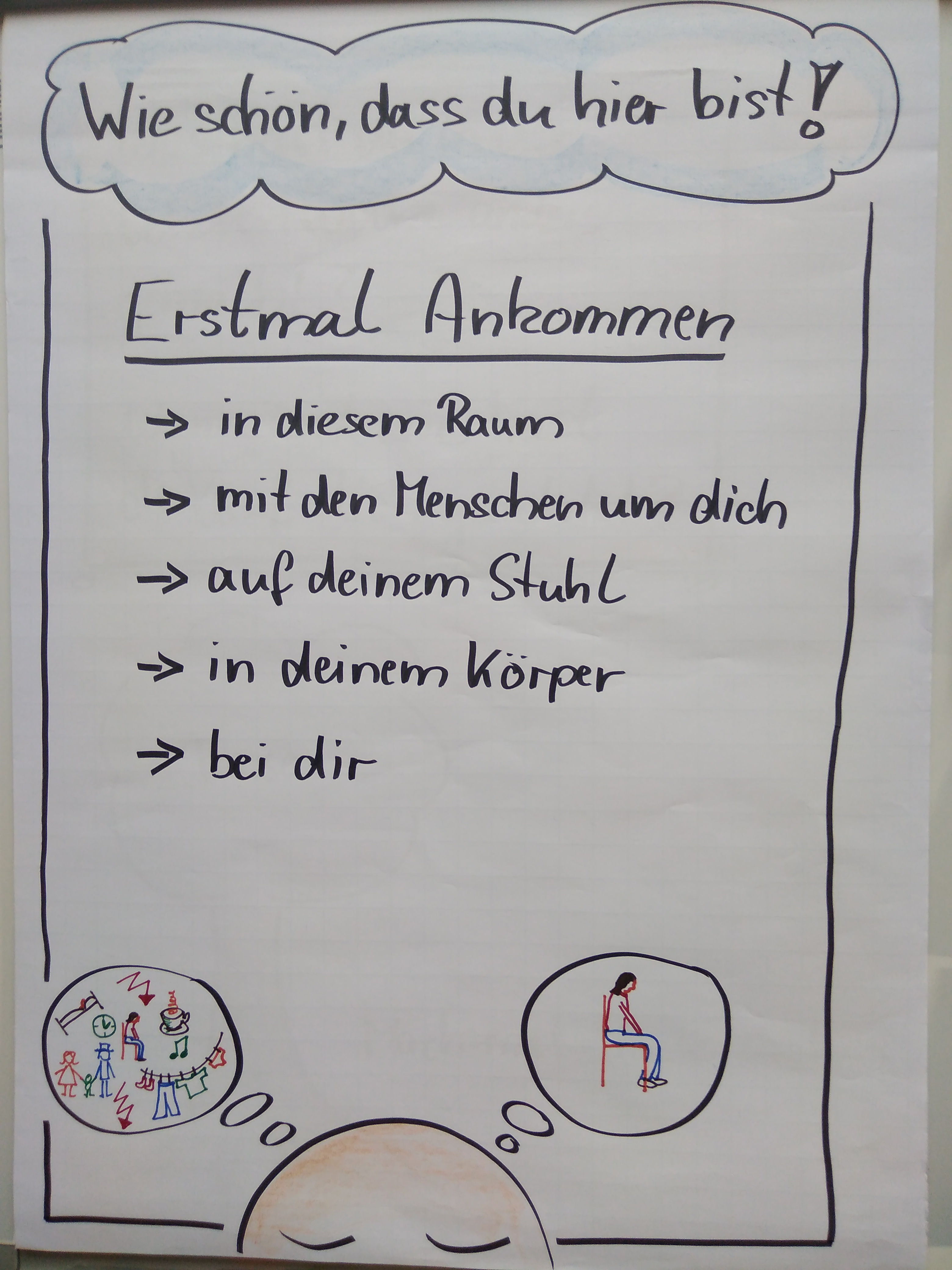 – Übungen, um im hier und jetzt zu sein; innehalten und Achtsamkeit sich selbst gegenüber.